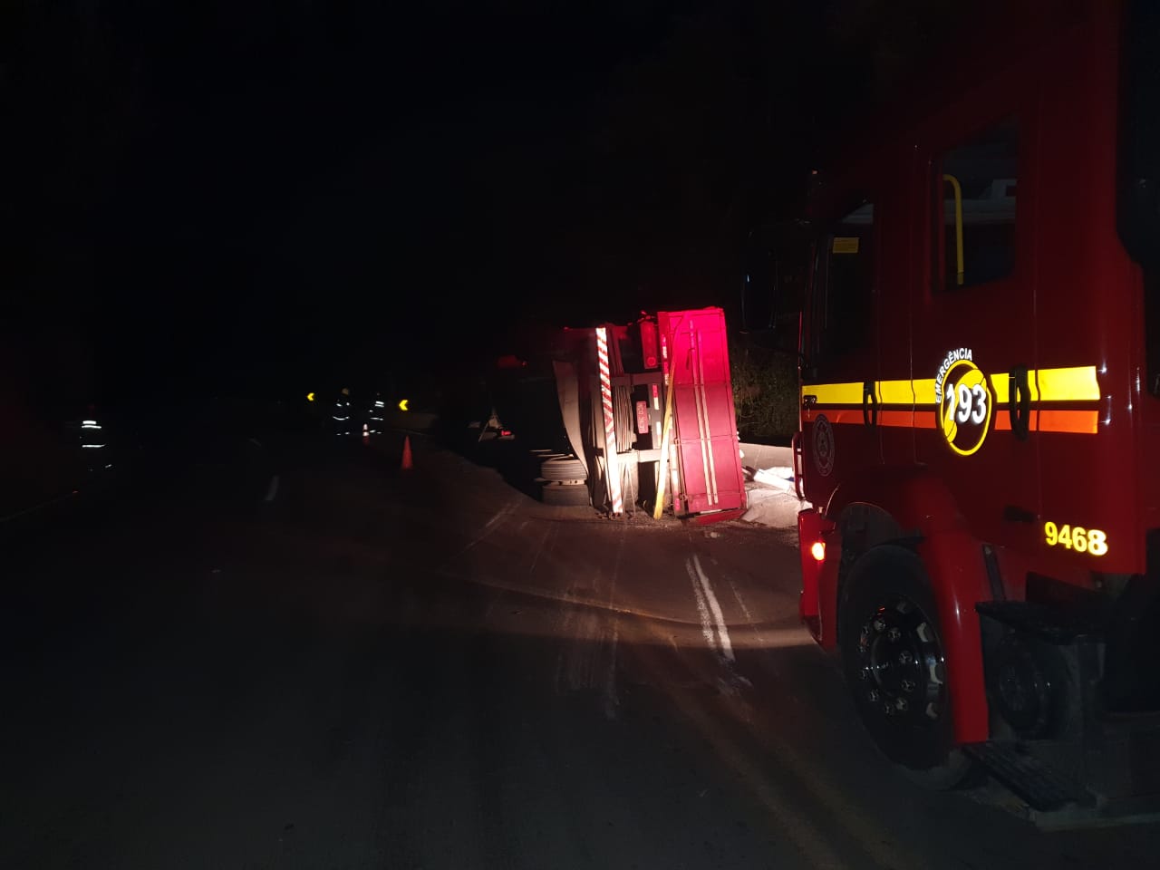 Caminhão Mercedes Benz com placas de Mafra (SC), tombou na pista sentido São Marcos/Vacaria. Motorista sofreu lesões leves e foi conduzido pelo Samu ao Hospital São João Bosco