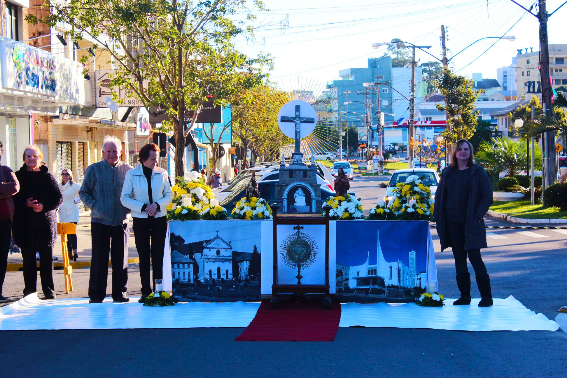 O padre Tadeu ressalta também a maior participação de público registrada nesse ano e agradece a colaboração dos voluntários. “Além de visitantes, tivemos boa participação de pessoas da nossa comunidade. Superou o ano passado, e estamos vendo isso pela fé das pessoas. Agradecemos a todos que vieram prestigiar e principalmente aqueles que trabalharam para deixar ainda mais bonito”, pontua. Uma das voluntárias dessa programação, que sempre dá suas contribuições à decoração das ruas, é Arildes Bertelli. Com 83 anos, há cerca de 10 ela se responsabiliza pela confecção do altar que fica na esquina da Avenida Venâncio Aires com a Rua Padre Feijó. “Esse é a o altar das famílias, eu que faço a decoração todos os anos. Sempre procuro fazer uma coisa diferente, essa vez temos o Monte Calvário, uma das primeiras igrejas de São Marcos e a igreja atual. São fotografias impressas nas toalhas”, declara Arildes, avaliando os tapetes desse ano. “Estou achando muito bonitos, são de um colorido maravilhoso. A decoração e a exposição dos tapetes está muito legal”, elogia a são-marquense.