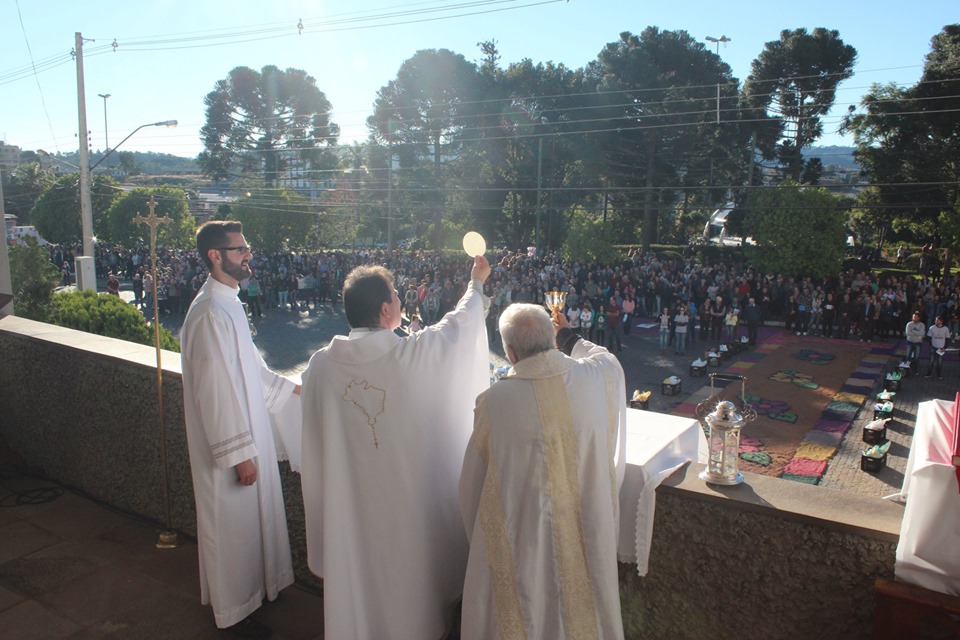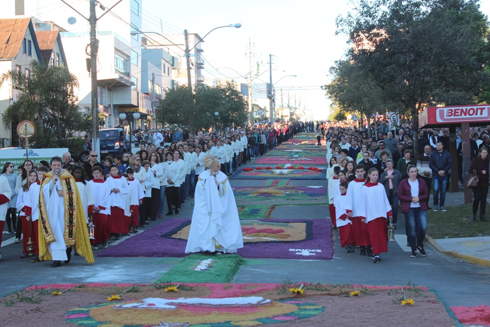 A missa campal iniciou às 15h e contou com a participação de quase 5 mil pessoas, que, após, seguiram a procissão em torno dos tapetes, pelas ruas que circundam a Praça Dante Marcucci, passando pelas quatro estações simbólicas: a saúde, os jovens, a família e os negócios. “O dia estava lindo, tinha bastante gente, e quando nos concentramos na frente da esplanada da Igreja vimos que era um público realmente grande”, revela o padre. Além da celebração religiosa, que aborda a presença de Jesus Cristo para os católicos, o que chama mais atenção são as artes nos tapetes. “Trabalhamos sempre em cima de temas diferentes, são sempre novos e não tem nenhum igual ao ano passado. Destacamos que são artistas da nossa comunidade, pessoas humildes e simples, que dedicaram algumas horas do dia para essa atividade”, ressalta Tadeu.